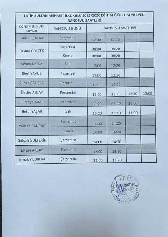 Okulumuz öğretmenlerinin 2025/2026 Eğitim Öğretim yılında veli görüşmeleri yapacakları günler ve saatler yayınlanmıştır. Öğretmen görüşmesi yapmak isteyen Tüm velilerimizin, ilgili tabloya uymalarını eğitim öğretim faaliyetlerimizin aksamaması adına rica ediyoruz.